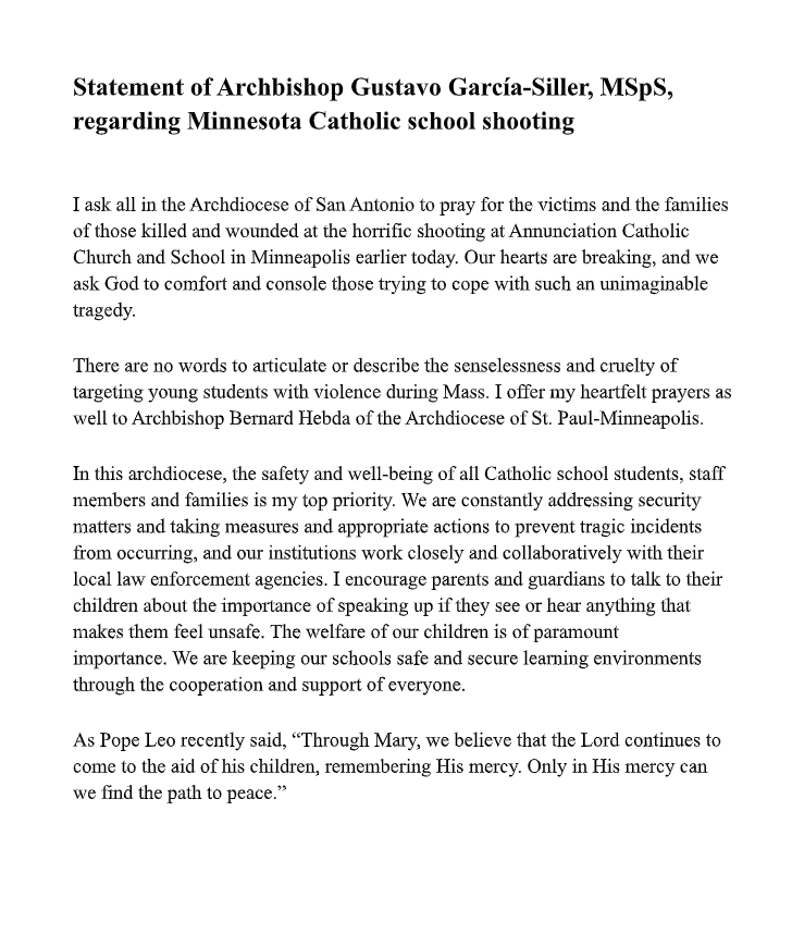 A statement from Archbishop Gustavo Garcia-Siller, MSpS